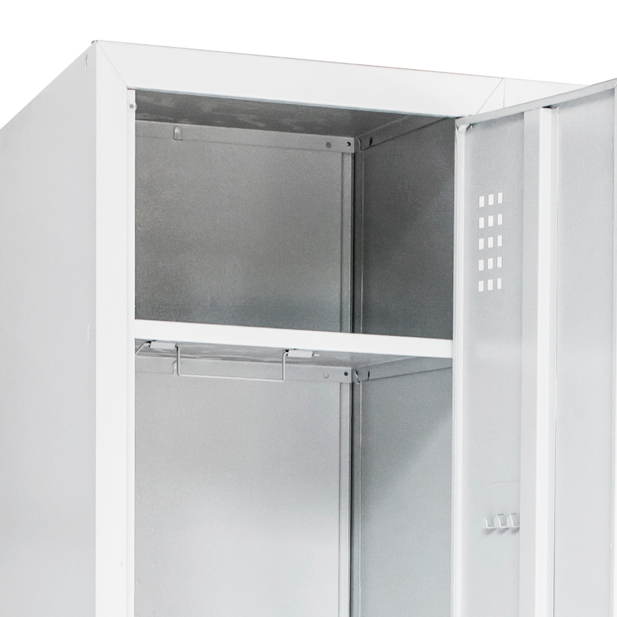 3) Комплектация. Шкафчики обычно стандартно оборудуются почтовыми (флажковыми) замками, полкой для головного убора, перекладиной для вешалок, крючками для полотенец.