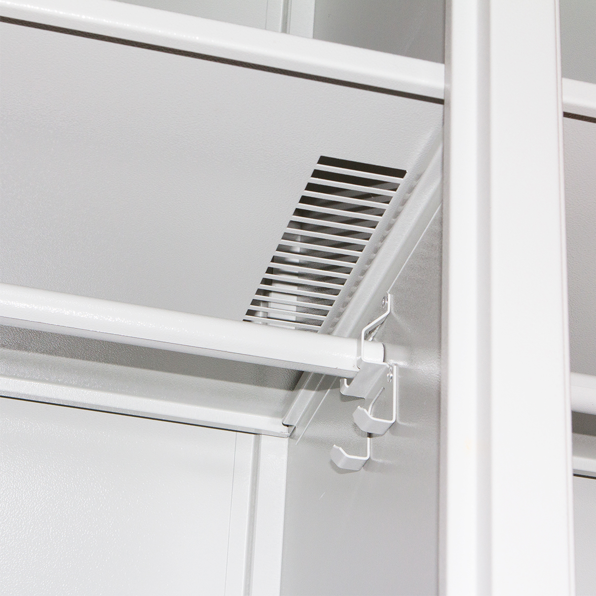 5) Вентиляция. Для предотвращения застаивания воздуха и избегания появления «неприятного и затхлого запаха» внутри шкафа, необходимы правильно расположенные в достаточном количестве вентиляционные отверстия. Поэтому при выборе шкафа металлического обязательно проверяйте данный критерий.