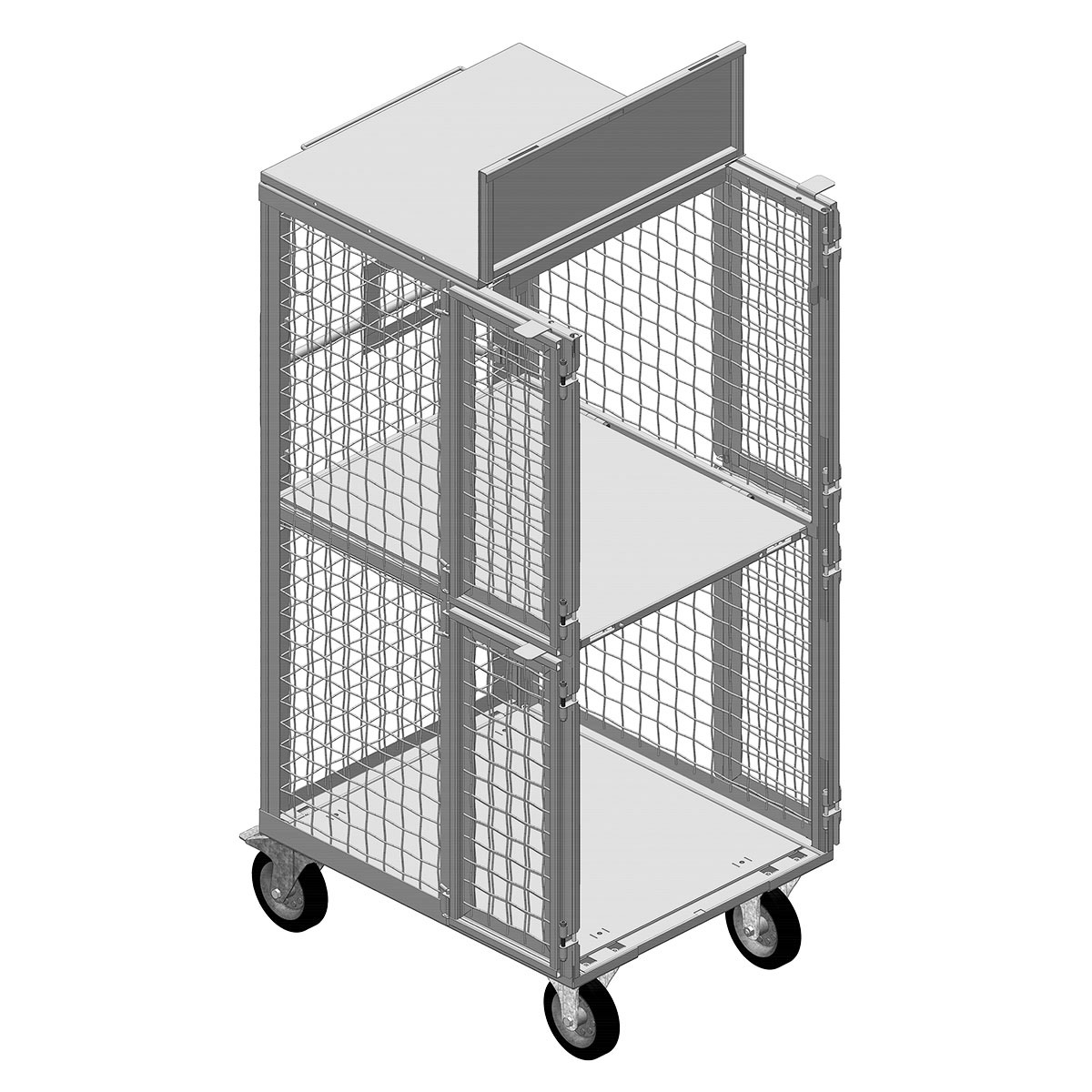 Почтовый контейнер (сетчатый) представляет собой металлическую конструкцию, которая обладает весом 100 кг (без груза) и максимальной способностью к перемещению груза весом до 400 кг. Передвижение осуществляется с помощью четырех прорезиненных колес диаметром 180 мм, два из которых жестко закреплены, другие два – поворотные с тормозными устройствами. Рекомендуемая скорость передвижения своим ходом 8 км/час.