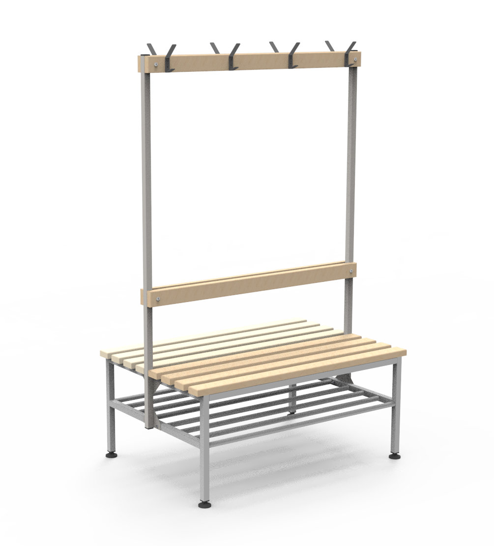 При необходимости лавочка комплектуется крючками для одежды 8 штук, которые крепятся на спинке или под сиденьем. Это особенно удобно в раздевалках, производственных цехах и спортивных комплексах.